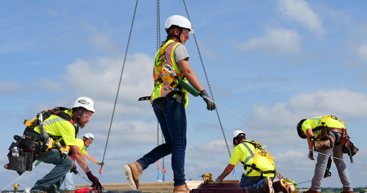 Alivia Towers (Local 322 - St. Paul, MN) working with her crew on setting the timber,.