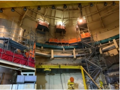 To ensure licensing of the reactor, seven of the 18 dome trusses had to be cut and modified allowing more clearance between the liner and the truss. Three of these trusses needed to be worked on above the reactor cavity. As shown in the bottom photo, the cavity’s water level is at approximately 65’ above the reactor core. The scaffold working platforms needed to be 85’ above the highest water line and over 140’ above the Reactor Core.