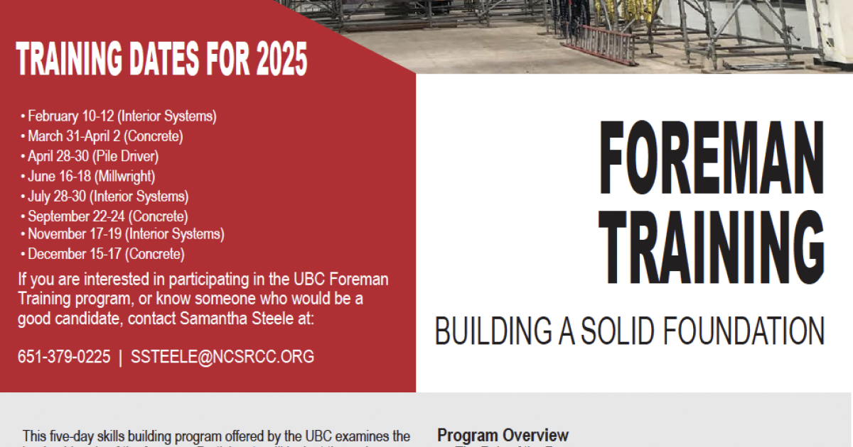 The Foreman Training Program is not an open-enrollment program. All requests for approval to attend this program must be coordinated through the District Vice-President’s Office. If you are interested in this program, please contact Samantha Steele at (651) 379-0225 or ssteele@ncsrcc.org at the Regional Council Office to ensure you are going through the proper channels.