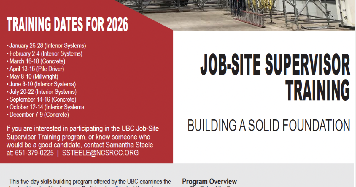 The Job-Site Supervisor Training Program is not an open-enrollment program. All requests for approval to attend this program must be coordinated through the District Vice-President’s Office. If you are interested in this program, please contact Samantha Steele at (651) 379-0225 or ssteele@ncsrcc.org at the Regional Council Office to ensure you are going through the proper channels.